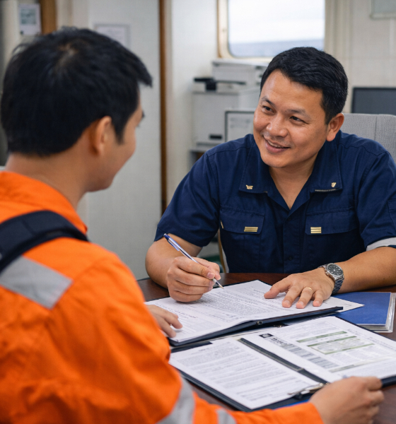 Multi-layer interviews conducted by experienced deck and engine professionals, focusing on competence, safety awareness, and vessel suitability.